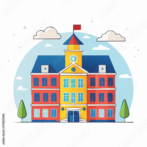 Investice do koncepce vzdělávání vektorové ilustrace s budovou školy, zlatými mincemi, knihami, školními potřebami, absolventskou čepicí a pohárem. Plochý designový prvek pro plakát, banner, tisk.