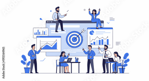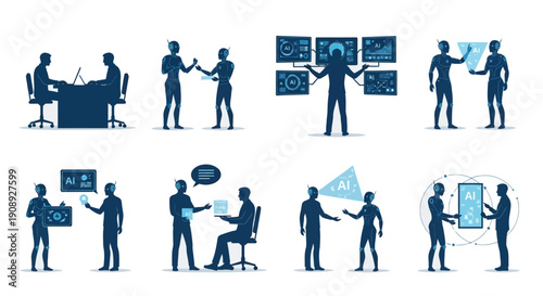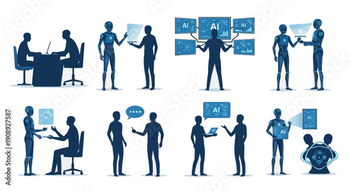 Izolovaný soubor podnikatelů pracujících v kanceláři, prezentace řeči na konferenci, vyjednávání, brainstorming, hledání nápad, handshaking vektorové ilustrace na bílém pozadí