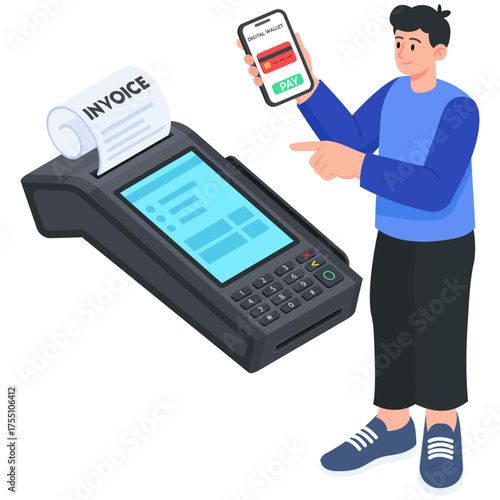 Izometrická 3D tiskárna stavební kostka na obrazovce mobilního telefonu, objednávka lidské ruky online, vektorové ilustrace. Služba 3D tisku pro aditivní výrobu na vyžádání.
