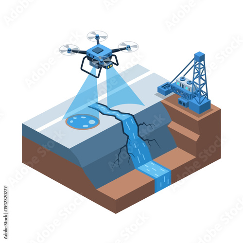 Izometrické doručování zásilek z dronů a logistický 3D vektor. Dálkově ovládaný vzduchový bezpilotní robot s rotorem a přepravním balíčkem kamery. Letecká expresní přeprava nákladu a rychlá přeprava