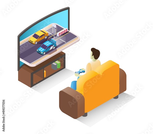 Izometrický mladý muž hráč hraje basketbalovou videohru s ovladačem sedícím na pohovce před televizí, ploché vektorové ilustrace. Online hraní, video konzolové hry.