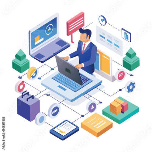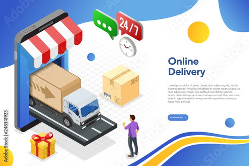 Izometrický smartphone s dodávkovým vozem, kurýr dává zásilku mužskému zákazníkovi, ploché vektorové ilustrace. Online expresní doručovací služba Domů, rychlá přeprava. Mobilní aplikace pro sledování balíčků.