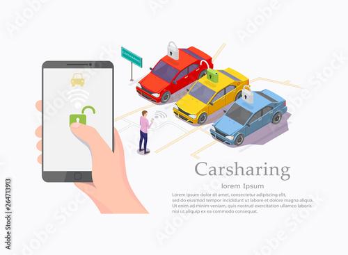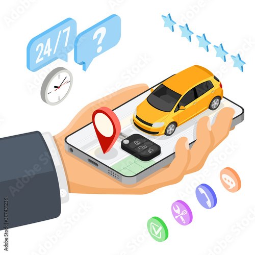 Izometrický smartphone s červeným auto na obrazovce, ploché vektorové ilustrace. Pronájem auta online koncept. Půjčovna aut app.