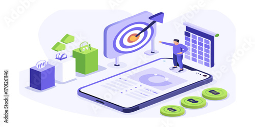 Izometrický smartphone s obytným domem na obrazovce, ploché vektorové ilustrace. Nemovitosti k nákupu nebo pronájmu přes internet. Pronájem domů Online koncept.