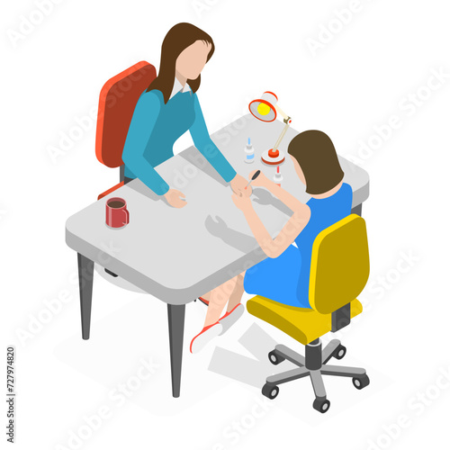 Izometrický číšník s protézou nohou a sluchadlem, který podává jídlo na stříbrném podnose nebo v restauraci cloche, plochá vektorová ilustrace. Mladý handicapovaný chlap pracující v restauraci. Životní styl osob se zdravotním postižením.