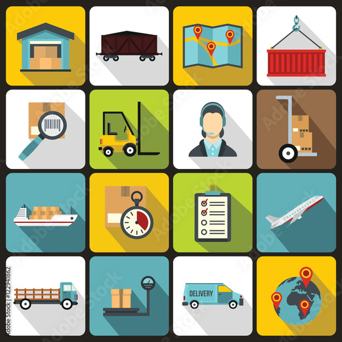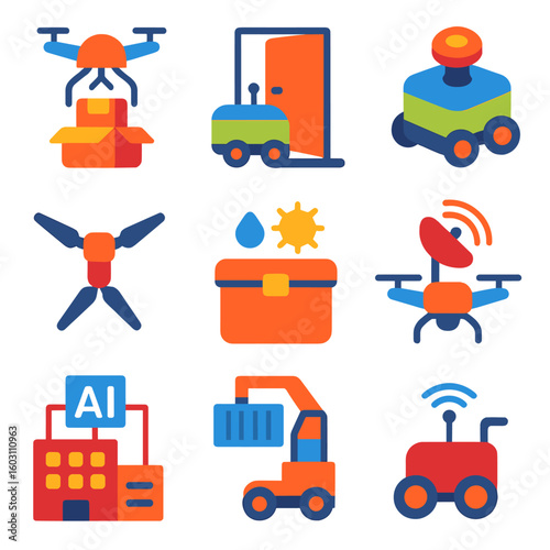 Izometrické skladníci a zařízení, vektorové izolované ilustrace. Nákladní automobil, vysokozdvižný vozík, automatizované robotické rameno, kartonové krabice, dopravní pás. Logistické skladové služby, dodávka, Doprava.