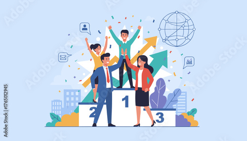 Šťastní vítězové vektor. Nadšení lidé vyhrávat jackpot cena ilustrace. Spinning fortune Wheel loterie a peníze dárek za odměnu