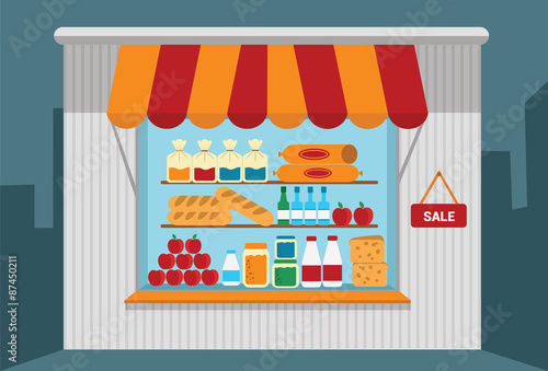 Jam store, ploché vektorové ilustrace. Ovocné džemy na policích vitríny. Prodavač stojí u pultu. Supermarket, obchod s potravinami konzervované ovoce sekce. Maloobchod malé firmy.
