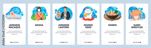 Japonská kultura a kuchyně webové stránky a mobilní aplikace onboarding obrazovek. Menu banner vektorová šablona pro vývoj webových stránek a aplikací. Japonský sumo zápas, gejša, maneki neko figurka.