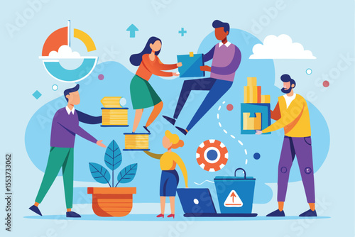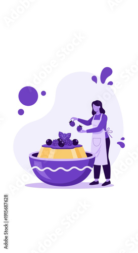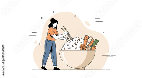 Japonské jídlo vektorové ilustrace. Malé postavy nalévají sójovou omáčku na obrovské nigiri sushi s lososem nahoře, drží hůlky, misku wasabi pasty. Tradiční asijská kuchyně, sushi bar, Restaurace