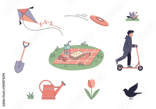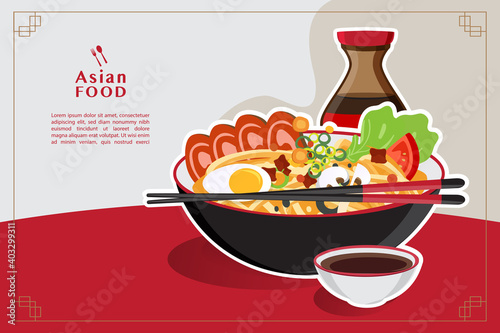 Japonské jídlo vektorové ploché ilustrace. Japonské, čínské nudle nebo těstoviny, sushi rohlíky, sójová omáčka, ruční hůlky. Plakát asijské kuchyně, banner.