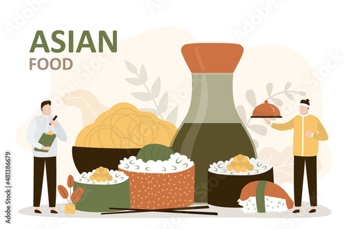 Japonské jídlo vektorové ploché ilustrace. Japonské maki sushi rolky, nigiri sushi, sójová omáčka atd. Tradiční asijská kuchyně plakát, banner.