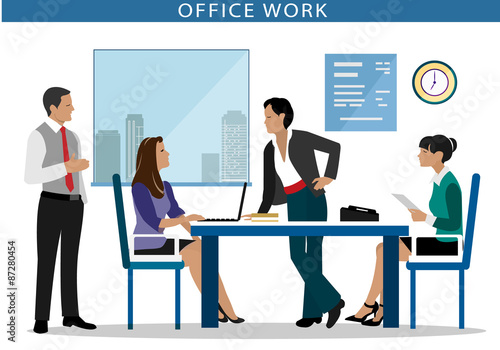 Koncept pracovního pohovoru vektorová ilustrace v plochém stylu. Manažer, ředitel, který vede rozhovor s kandidátkou na mladou ženu.