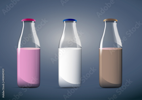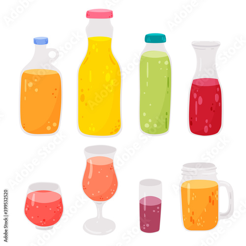 Juice produkty ad. Vektorové 3D ilustrace. Návrh šablony lahví. Ovocné šťávy značky balíčky reklamní plakát rozložení. Plné a prázdné skleněné lahve.