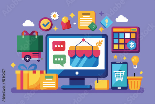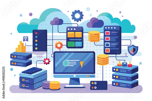 Kanban concept vector flat ilustrace. Lidská ruka pohybující se karty na pracovní desce, počítač s mozkem na obrazovce, ozubená kola atd. Agilní složení metodiky kanban pro webový banner, webovou stránku atd.