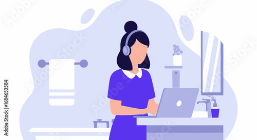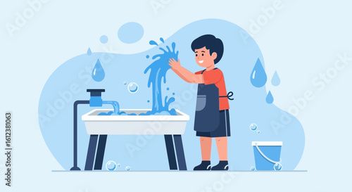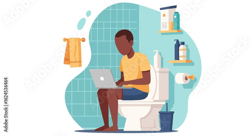 Kid chlapec sedí na záchodové míse s smartphone, ploché vektorové ilustrace. Toaletní rutina, závislost na smartphonu.