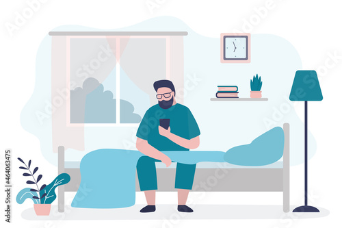 Kid chlapec sedí na záchodové míse s smartphone, ploché vektorové ilustrace. Toaletní rutina, závislost na smartphonu.