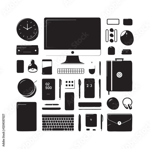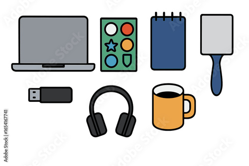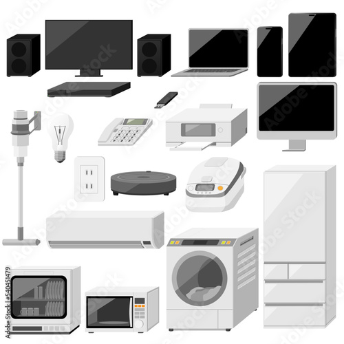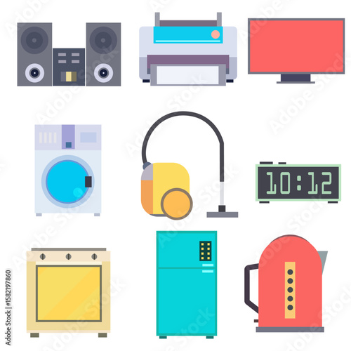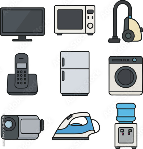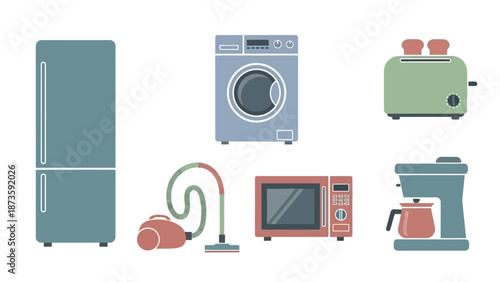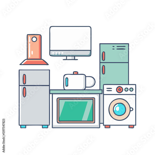 Kuchyň. Vektorová sada domácích elektrických spotřebičů a nádobí. Mikrovlnná trouba, lednice, rychlovarná konvice, mixér, trouba.