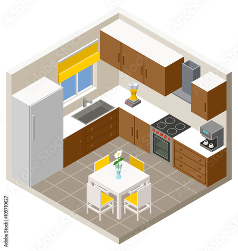 Koncept instalace kuchyňského nábytku. Vektor izometrické výřez kuchyně interiér s pracovník instalační montáž kuchyňské linky.