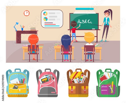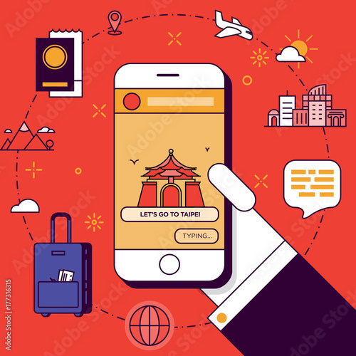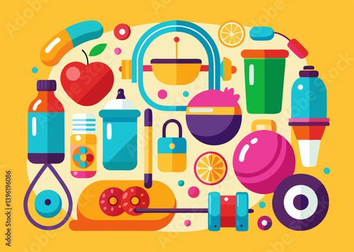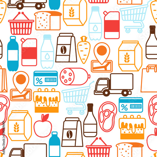 Interiér kuchyně s nábytkem a potravinami pro kolo domů rozvoz jídla téma plakát, vektorová plochá ilustrace. Kuchyňská místnost s krabičkou na pizzu na víno, rychlé občerstvení na pultu, rozvoz kola s taškou na potraviny