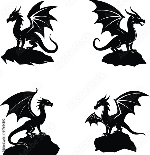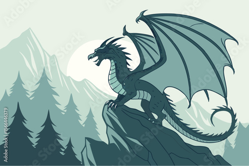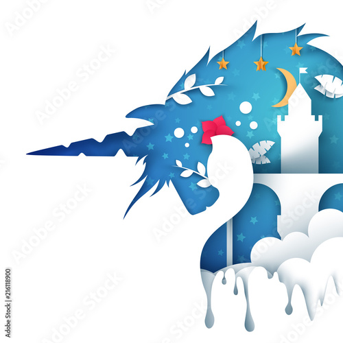 Vektorové vrstvené papírové řezané řemeslné styl pohádkové složení středověkého rytíře bojujícího s obrovskými drakovými siluetami.