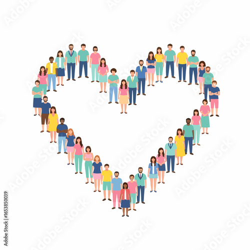 Velká skupina lidí tvořících symbol tvaru lidského srdce stojící pohromadě, ploché vektorové ilustrace. Lidé se shromažďují. Láska, symbol uznání.