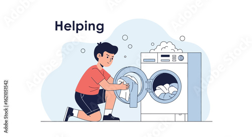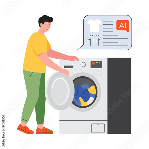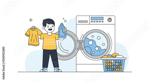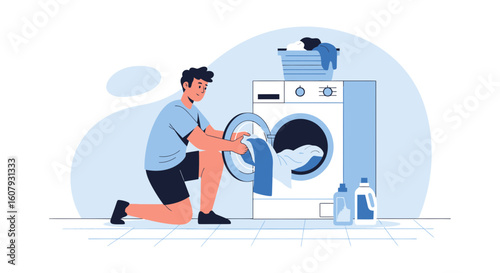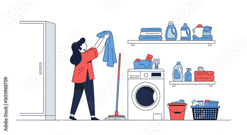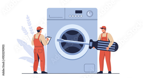 Prádelna s velkou pračkou a malými postavami, vektorový plochý design ilustrace. Koncept prádelny mincí pro webový banner, webovou stránku atd.