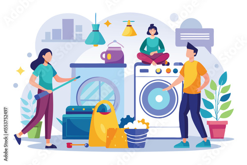 Prádelna s malými postavami, které nakládají velkou pračku a vkládají do ní mince, vektorový plochý designový obrázek. Koncept samoobslužného praní pro webový banner, webovou stránku atd.