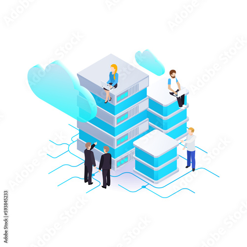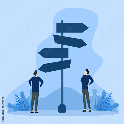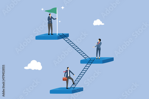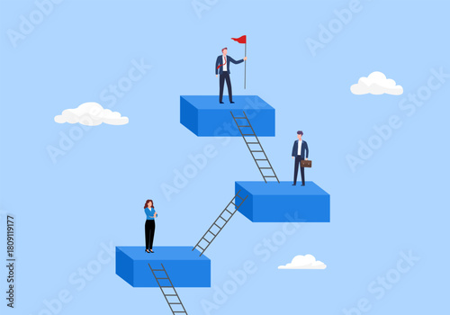Vektorová ilustrace podnikatele a jeho týmu. Vedoucí stojící na vrcholu schodů a při pohledu přes spyglass nebo ruční dalekohled. Obchodní vize, vedení koncept plochý styl designu.