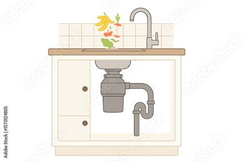 Unikající vodní potrubí pod kuchyňským dřezem, vektorové realistické ilustrace. Instalatérská nehoda, koncepce instalatérských služeb.