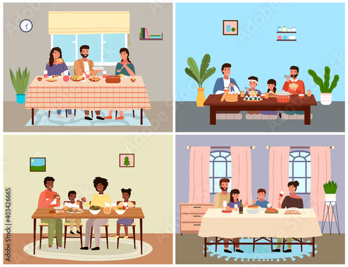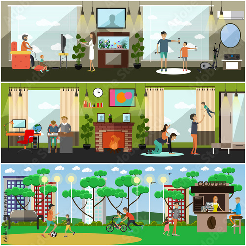Vektorová sada plakátů, bannerů s otci hrajícími video a hry pro volný čas, procházky v parku, sportování a domácí úkoly se svými dětmi. Péče o děti a rodičovství koncept plochý styl designové prvky.