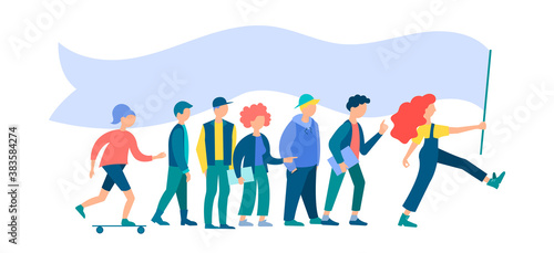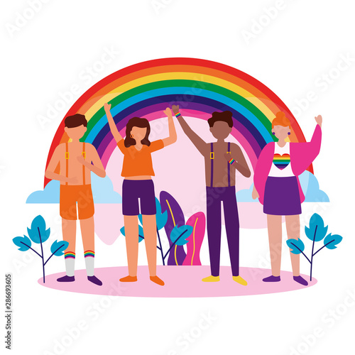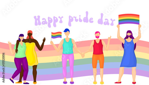 LGBT Pride Parade, ploché vektorové izometrické ilustrace. Lidé drží duhovou vlajku. Pochod hrdosti, událost nebo festival.