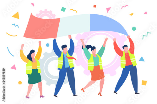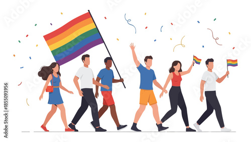 LGBT Pride Parade, ploché vektorové izometrické ilustrace. Lidé drží duhovou vlajku. Pochod hrdosti, událost nebo festival.