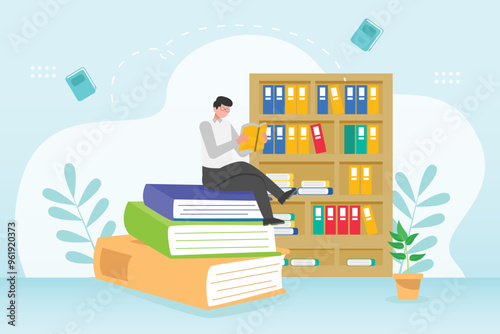 Knihovna, knihkupectví s knihovnou a knihami na policích, čtení mužských a ženských postav, výběr knih, vektorová ilustrace. Vzdělávací koncept pro webový banner, webovou stránku atd.