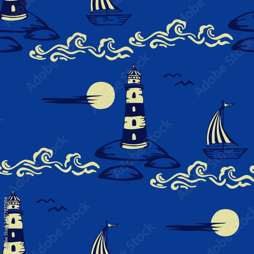 Maják na pobřeží oceánu a zuřící vlny, vektorové ilustrace v papírovém uměleckém řemeslném stylu. Maják symbolizující cestu vpřed, bezpečnost. Letní cestování po moři, cesta, dobrodružný koncept ve stylu střihu papíru.