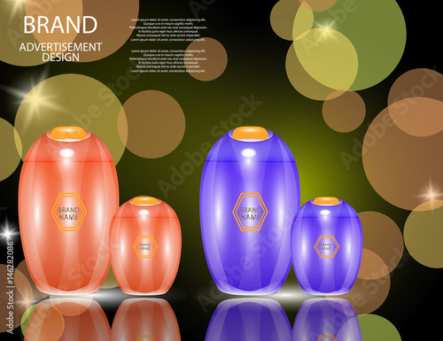 Promo plakát na mytí nádobí. Vektorové 3D realistické ilustrace mytí nádobí tekutých plastových lahví. Čistič nádobí 2 v 1 plus mýdlo na ruce ad.