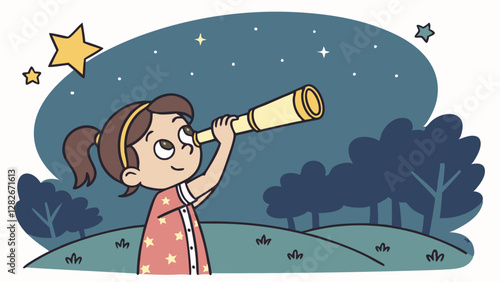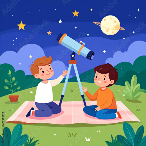 Malé děti při pohledu přes dalekohled do hvězdné oblohy baví čas v noci parku vektorové ilustrace. Děti zkoumající vesmír s planetami a souhvězdími hvězd