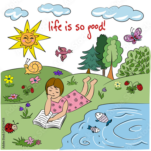 Holčička čte knihu na posteli. Vektorová ilustrace v komiksovém pop artovém stylu. Dívka studuje abecedu.