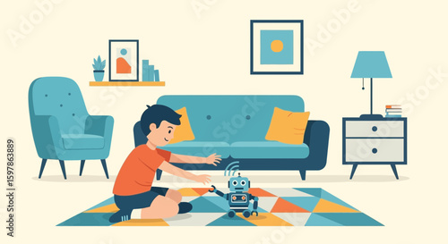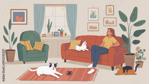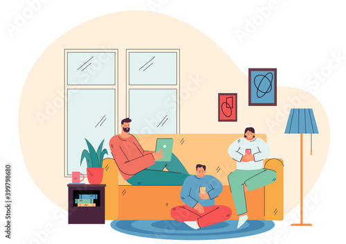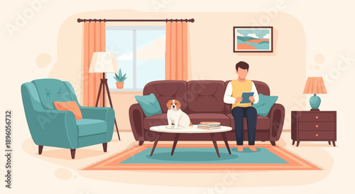 Obývací pokoj interiér ručně kreslené vektorové ilustrace. Domácí moderní design interiéru. Útulný pokojový nábytek a doplňky. Pohodlná pohovka, stůl, gauč, židle.