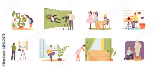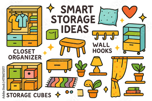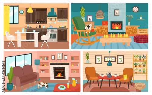 Obývací pokoj interiér ručně kreslenou vektorovou ilustrační sadu. Domácí moderní design interiéru. Útulný pokojový nábytek a doplňky. Pohodlná pohovka, krb, stůl, gauč, židle.