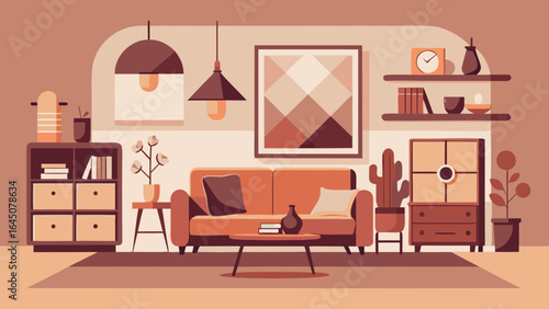 Interiér obývacího pokoje, ploché vektorové ilustrace. Apartmánový pokoj s útulnými pohovkami, kobercem, nástěnnými policemi, šatní skříní, domácími dekoracemi.