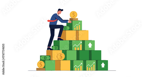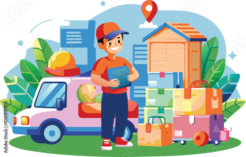 Vektorová ilustrace pracovníka tlačícího nákladní vozík nebo plošinový vozík s kartonovými krabicemi. Služby doručovací společnosti. Loader concept plochý styl designový prvek.