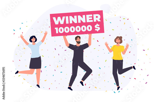 Loterie vítěz odměna vektor. Muž dostává peníze šek dárek a blahopřání. Kasino jackpot, prozradí nebo karban soutěž vítězství. Šťastný milionář charakter