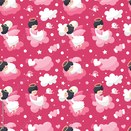 Magic unicorn bezešvé vzor. Vektorové ručně kreslené jednorožci spí na oblacích na noční obloze.