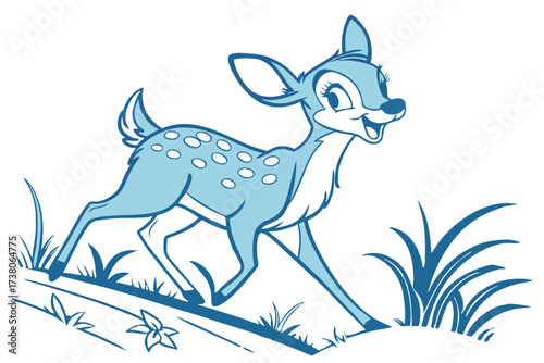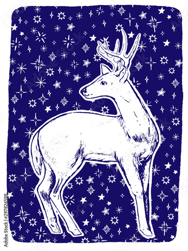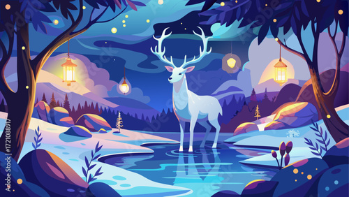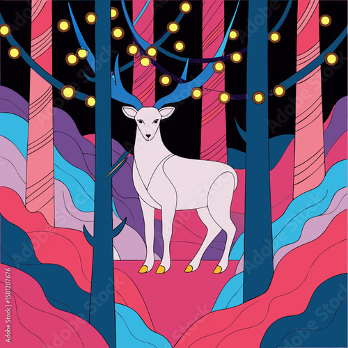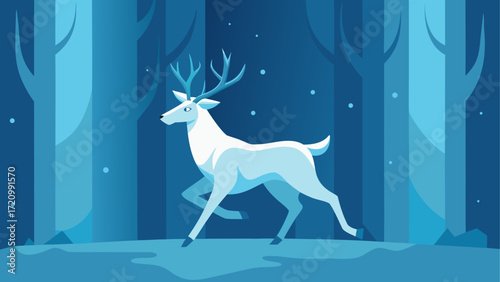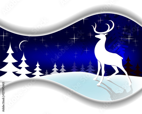 Vektor vrstvený papír řez styl pohádkové kompozice. Kouzelný jednorožec v lese v noci, mýtická pohádková postava silueta. Krásná pohádková scéna v bílé a modré barvě.