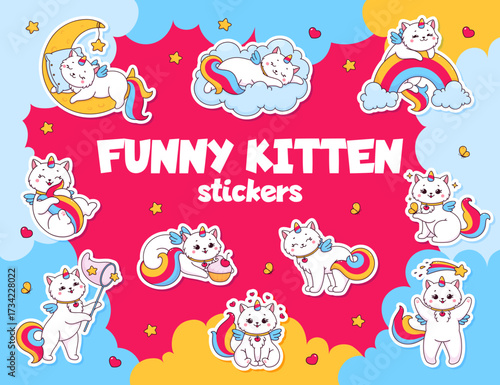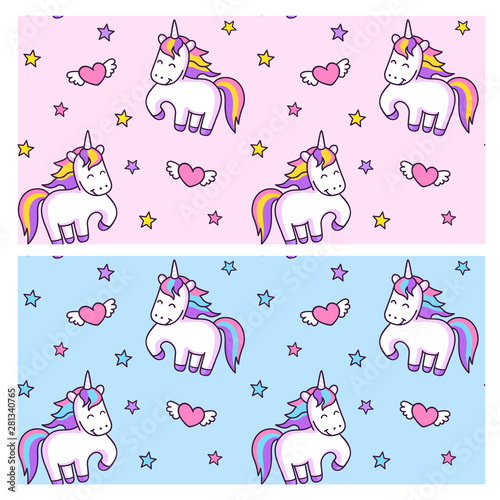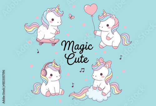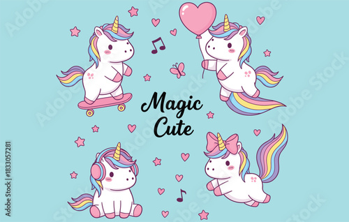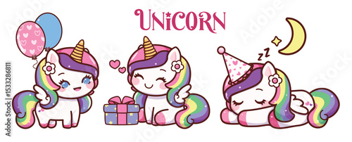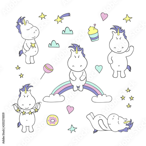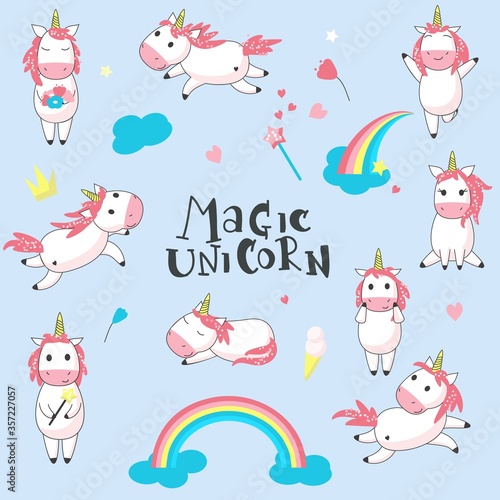 Cute magic unicorn icon set. Vektorové ručně kreslené ilustrace romantické mýtické stvoření jednorožec a duhy, mraky, srdce, kouzelná hůlka, koruna, zmrzlina, květiny.