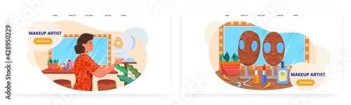 Vizážistka design vstupní stránky, sada šablon bannerů webových stránek, plochá vektorová ilustrace. Profesionální kosmetička, Vizážistka. Make-up kurzy, make-up školy.