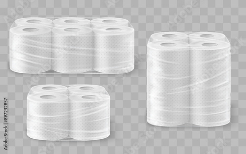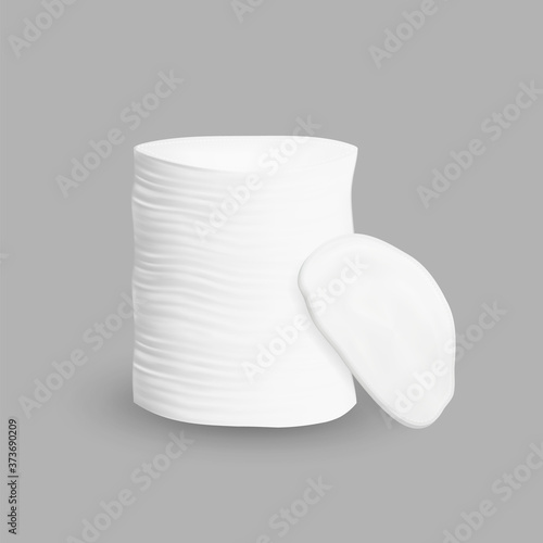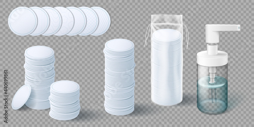 Kosmetické bavlněné podložky pro odstranění make-upu. Hygienické bílé kosmetické disky balíček maketa set. Odstraňovač make-upu prázdná plastová láhev šablona. Vektorové ilustrace izolované na průhledném pozadí.