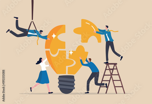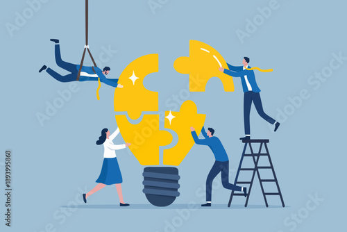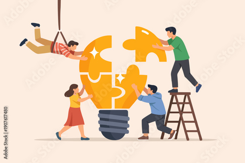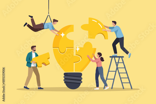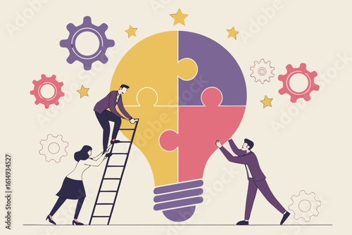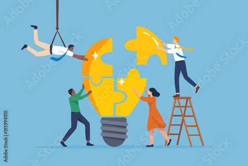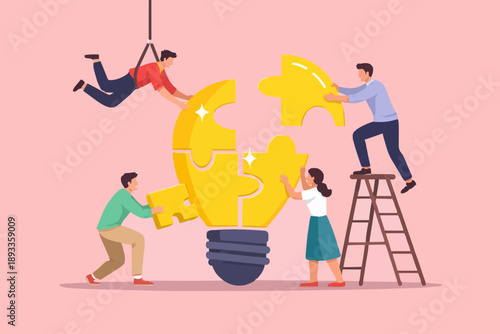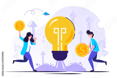Mikropodnikatelé pěstují obrovský strom peněz, vybírají z něj dolarové mince, drží vektorovou ilustraci žárovky. Vydělávání peněz, finanční zisk, investiční koncept pro webový banner, webovou stránku atd