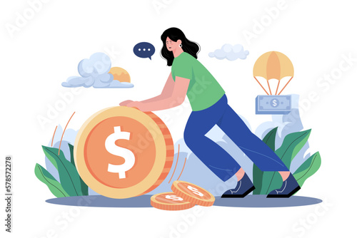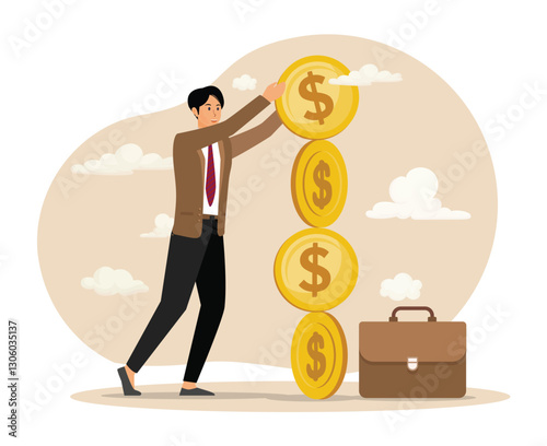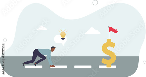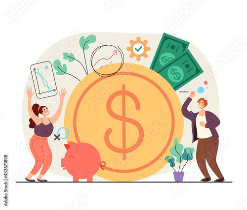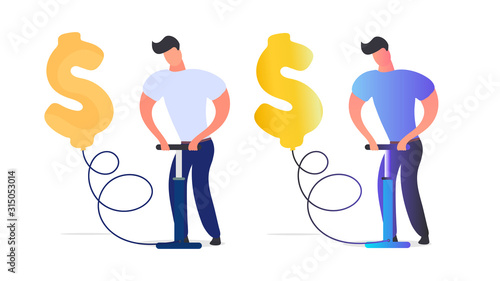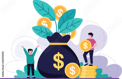 Podnikatelé drží žárovku, zalévají peníze a vybírají z ní dolary, vektorové ilustrace. Růst podnikání, vydělávání peněz, investice do nové myšlenky, koncept inovačního projektu.